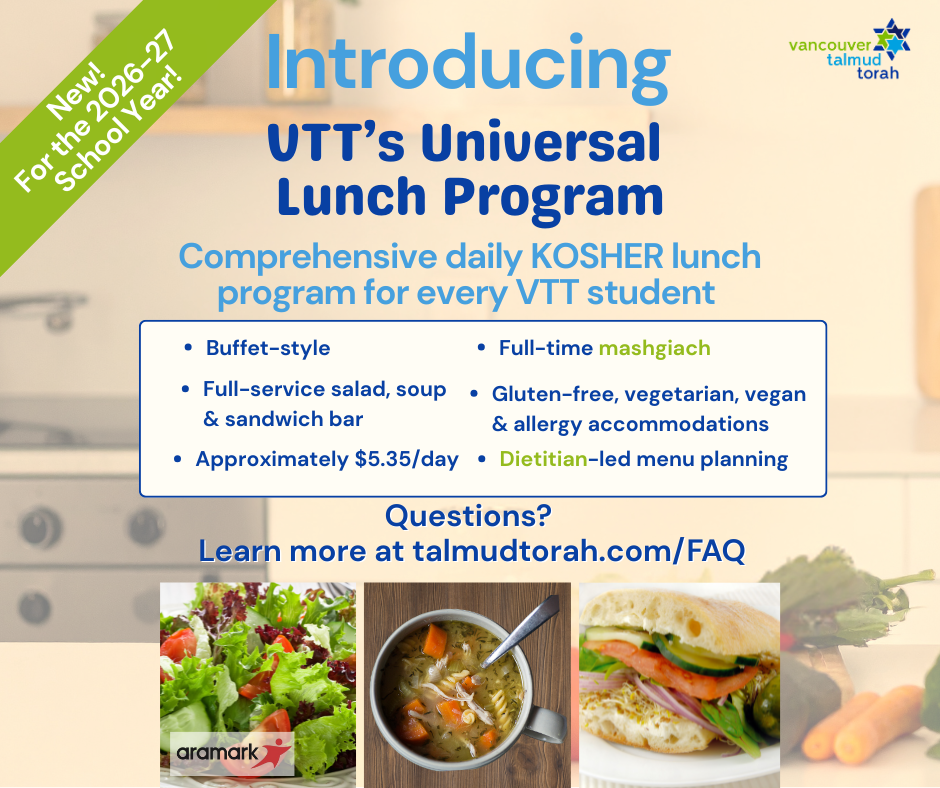 We are proud to partner with Aramark Canada to offer a kosher lunch each day for every child from Rishonim to Grade 7. The approximate cost for a buffet-style, all you can eat kosher lunch program featuring daily hot entrées, plus a salad, soup, and sandwich bar, will be $5.35/day. This program will be embedded in our tuition. To support families during the transition, VTT is subsidizing a portion of the actual cost, resulting in an annual levy for the 2026-27 school year of $950 per child or $95/month.